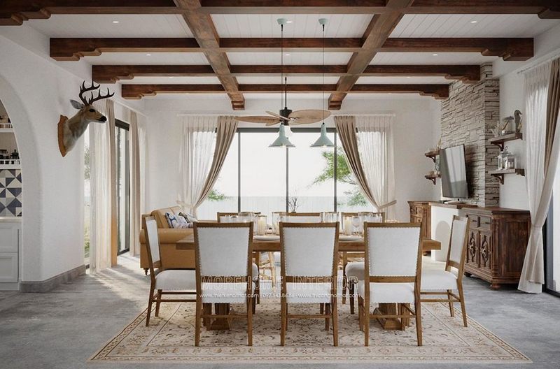 Nội thất phòng ăn gỗ tự nhiên được bố trí hợp lí mang đến sự sang trọng và thông thoáng, tạo cho gia chủ thuận tiện hơn