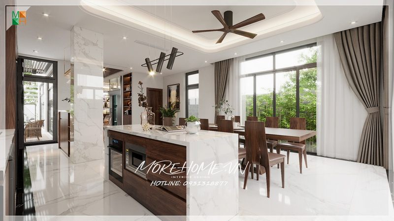 Trang trí nội thất phòng bếp ăn hiện đại sang trọng, độc đáo với điểm nhấn gỗ óc chó từ tủ bếp, bộ bàn ăn,bàn đảo bếp.