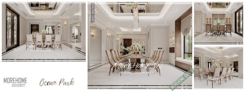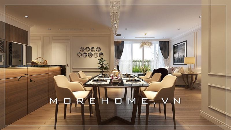Tổng thể thiết kế phòng ăn với nội thất gỗ óc chó tân cổ điển cho biệt thự sang trọng, đẳng cấp tại công trình Ocean Park do Morehome thực hiện