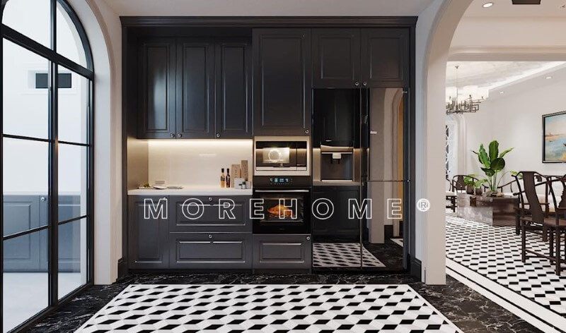 Tủ bếp gỗ óc chó hiện đại được sản xuất bởi nội thất Morehome, phá cách với thiết kế cánh pano đơn giản, bắt mắt.