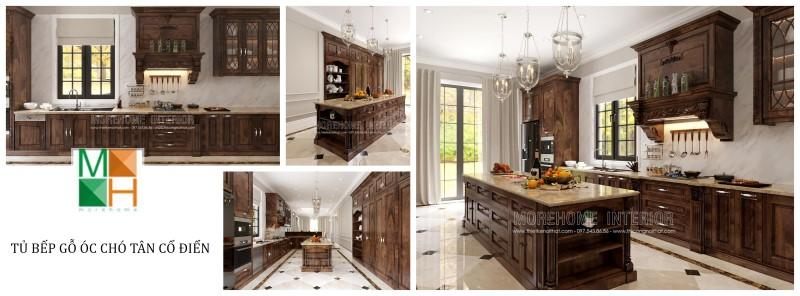 Đặc điểm của của tủ bếp tân điển là phải sử dụng chất gỗ tự nhiên, vậy nên tủ bếp gỗ óc chó đang vật liệu được lựa chọn nhiều nhất.
