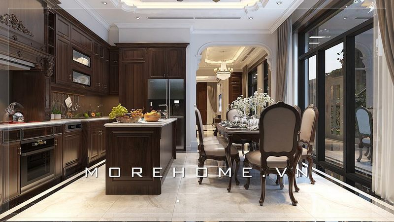 Chiếc bàn đảo bếp được thiết kế cân đối ở giữa. Có nhiều khách hàng chắc hẳn cũng chưa hiểu rõ hết công năng của chiếc bàn đảo bếp này được sử dụng làm gì? Đối với những căn hộ diện tích lớn, nhà biệt thự hoặc nhà phố. KTS Morehome thường tư vấn khách hàng sử dụng thêm phần đảo bếp tại khu vực phòng bếp. Bởi chiếc bàn đảo bếp này có rất nhiều công dụng trong căn bếp. Chúng được sử dụng giống như một chiếc bàn ăn nhỏ hoặc chúng được sử dụng làm khu vực sơ chế cũng như chế biến hoặc chúng được sử dụng làm khu vực quầy bar nho nhỏ hoặc chúng được sử dụng làm khu vực để đồ ăn khi chế biến xong và để đồ....